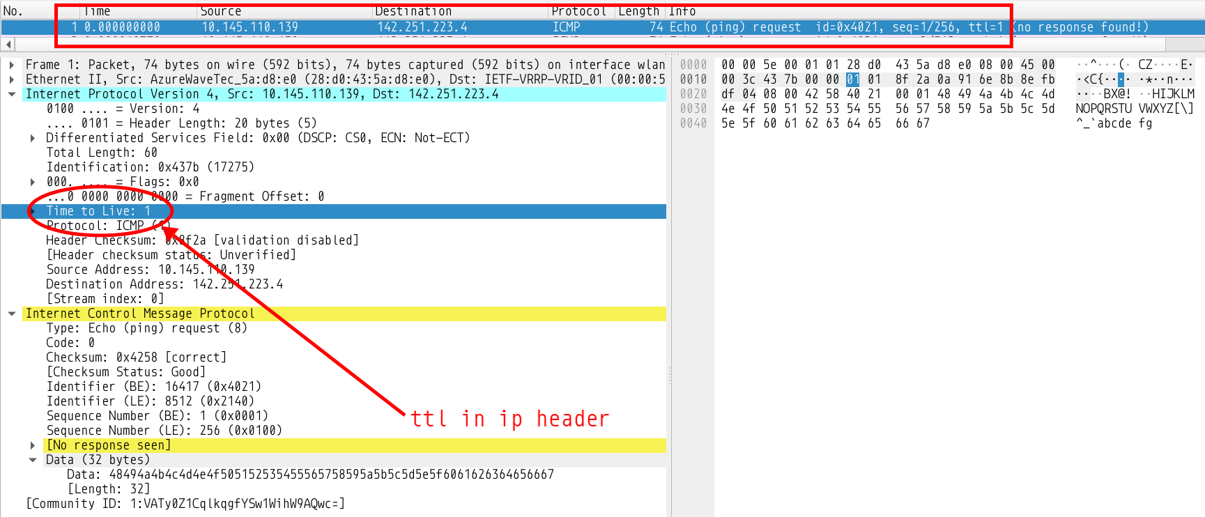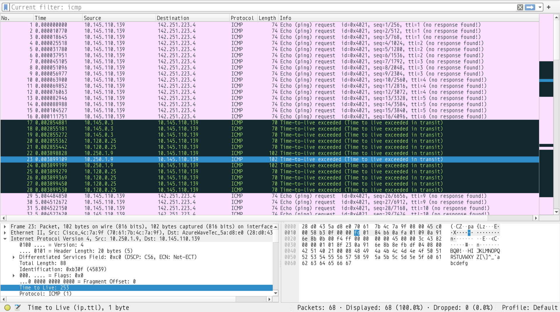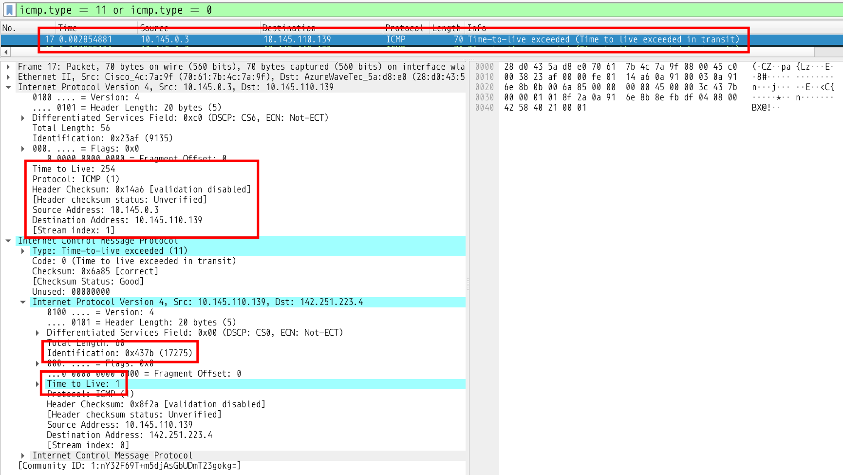 You can see the IP Header of the request packet attached and its Identification field contains the value of the identifier of the ping whose TTL expired, which is the first packet, the one with the identification 0x437b mentioned above. The TTL field is set to 254. It was probably set to 255 (max possible) and decremented by one when the source (me) received it
