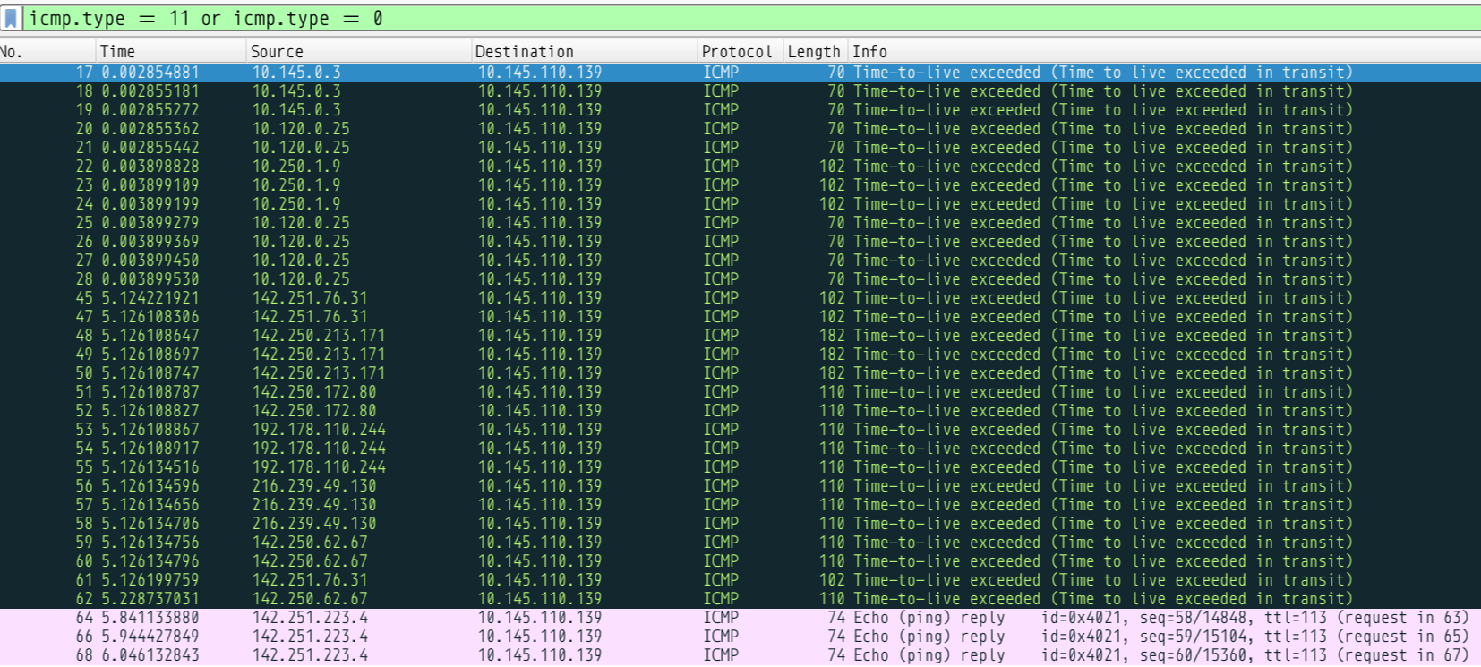 We see the first reply is from 10.145.0.3 which corresponds to our first entry in the traceroute