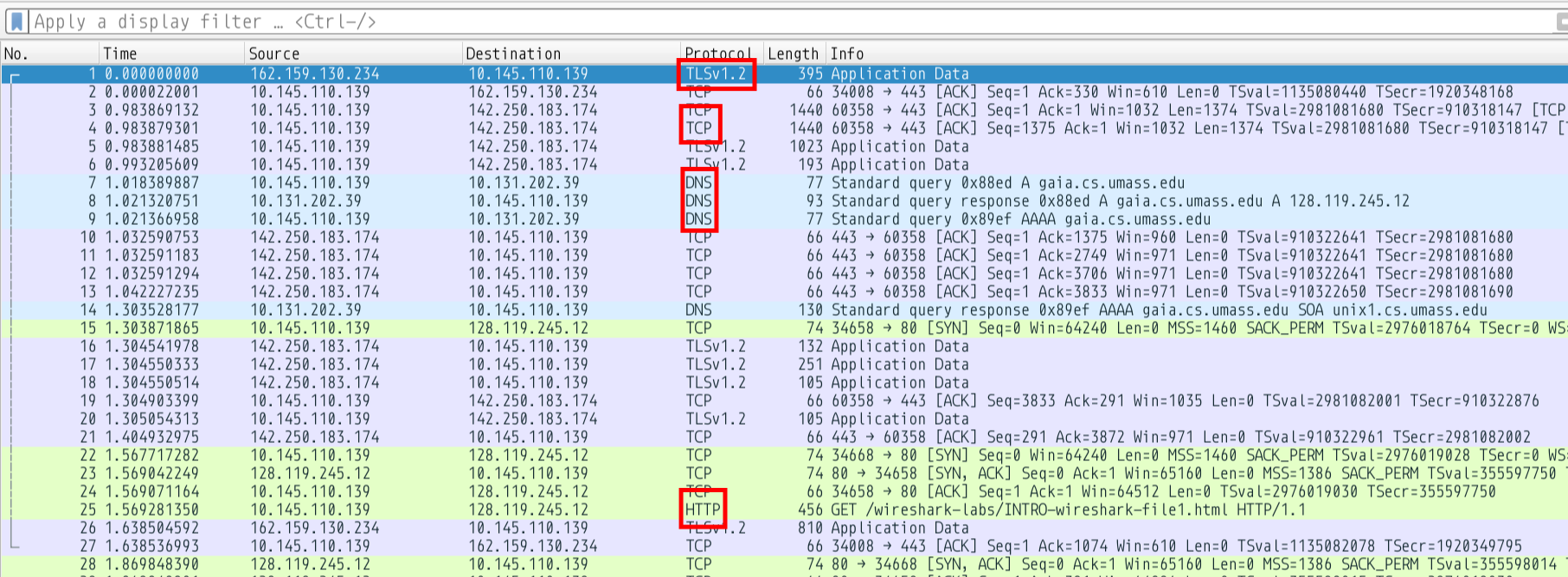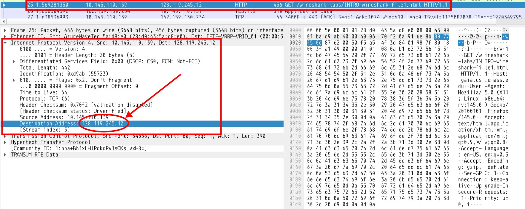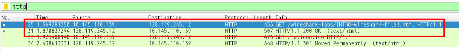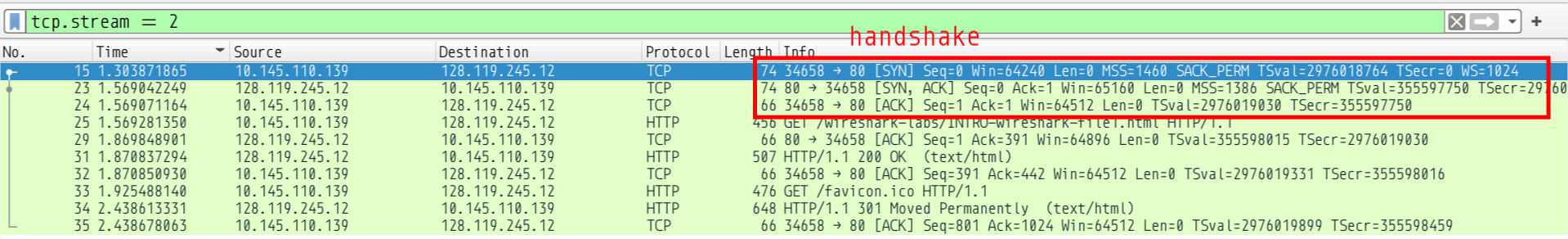 We can also look at the GET request and the acknowledgement sent by the server. Note the GET had a TCP payload of 390 bytes