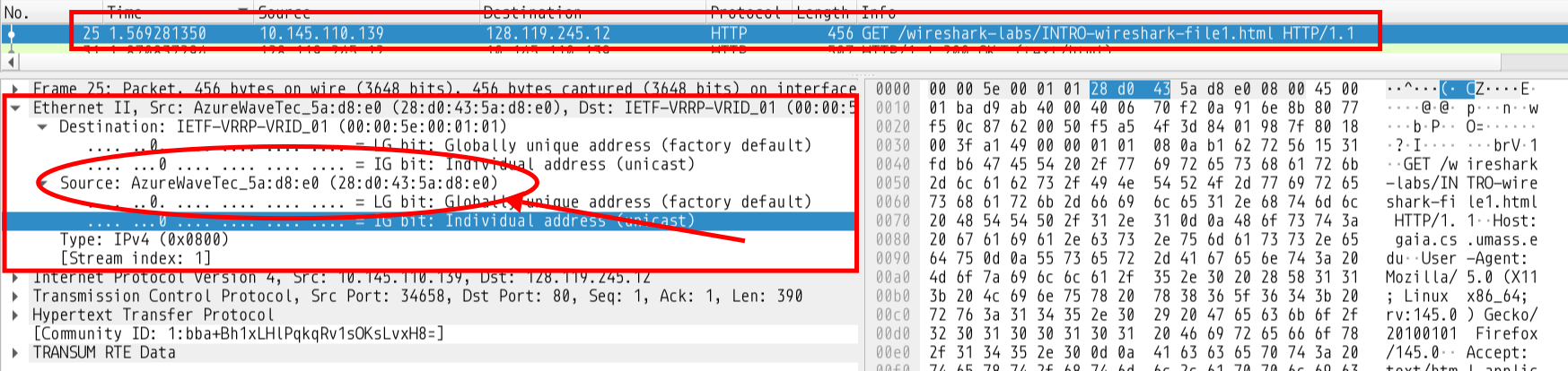 Medium Access Control address is also called the Ethernet address and is a unique ID given to every network hardware component. To find the MAC addresses in this HTTP packet we simply need to move a layer above the IP header and look at the Ethernet Header5