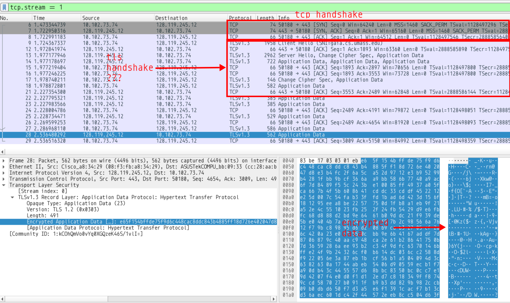 I don’t know the internals of TLSv1.3 enough to properly recognise where the handshake ends, but as we can see key exchanges and random secrets and certificates are being exchanged in there somewhere